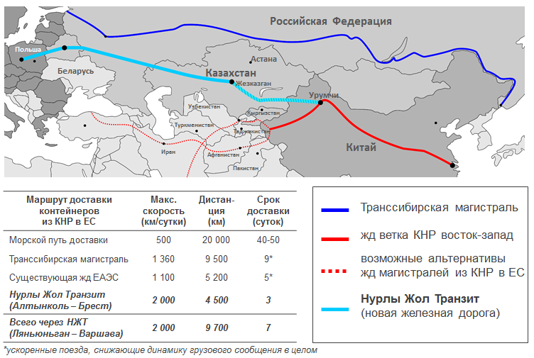 Отдельно построенная магистраль обеспечит синхронность движения грузов и, соответственно, доставку точно в срок без снижения динамики существующего грузового сообщения в целом (основной фактор негативного воздействия ускоренных поездов в настоящее время). Перевозка контейнеров в два яруса обеспечит снижение расходов по транспортировке грузов на 30-50 процентов, а также обеспечивать доставку из Урумчи в Варшаву за 3 суток. Кроме того, пропускная способность данной магистрали позволит обрабатывать до 7 миллионов контейнеров в год. Вместе с тем, соединение новой ветки с Жезказганом интегрирует планы Китая по транзиту на Актау.