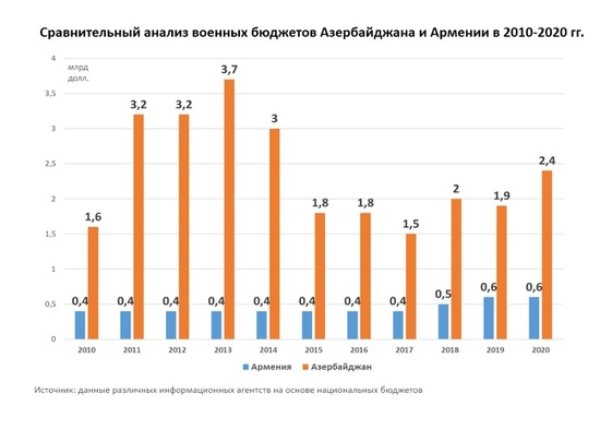 В период с 2009 по 2019 г. нефтяные и газовые доходы от экспорта питали военный бюджет Азербайджана, работая на подготовку военного реванша. По данному показателю Азербайджан превосходил Армению как минимум в 3 раза, в целом за десятилетие не имея показателя ниже $1,5 млрд. При этом Азербайджан вооружался не только своим стратегическим союзником Турцией, осуществлял массовые закупки БПЛА и систем залпового огня в Израиле, но и получил доступ к современному российскому вооружению (танки Т-90, боевые машины пехоты БМП-3, бронетранспортеры БТР-82А, САУ «Мста-С» и «Вена», другие типы вооружений). На протяжении всего десятилетия Азербайджан щедро платил «Рособоронэкспорту» за вооружение, которое заговорило в конце сентября этого года. Это дополнялось безоговорочной поддержкой Турции позиций Азербайджана и охлаждением межгосударственных отношений между Россией и Арменией после прихода к власти Н. Пашиняна: последний считается в России ненадежным партнером, ориентирующимся во внешней политике на ЕС и США.