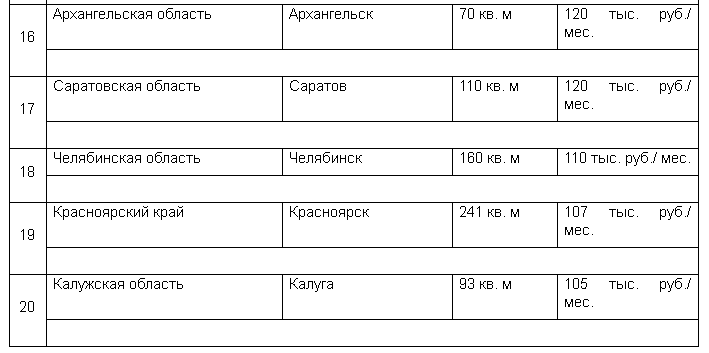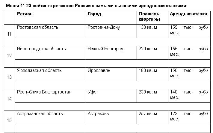 Места с 11 по 20 заняли Ростовская область (11-е место, 155 тыс. рублей в месяц), Нижегородская область (12-е место, 150 тыс. рублей в месяц), Ярославская область (13-е место, 150 тыс. рублей в месяц), Республика Башкортостан (14-е место, 140 тыс. рублей в месяц), Астраханская область (15-е место, 123 тыс. рублей в месяц), Архангельская область (16-е место, 120 тыс. рублей в месяц), Саратовская область (17-е место, 120 тыс. рублей в месяц), Челябинская область (18-е место, 110 тыс. рублей в месяц), Красноярский край (19-е место, 107 тыс. рублей в месяц) и Калужская область (20-е место, 105 тыс. рублей в месяц).