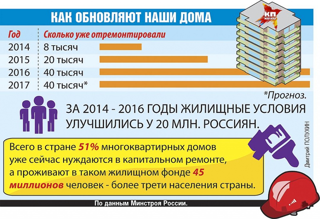 - В 2014 году начинали с 8 тысяч домов. В 2015 году - 20 тысяч. Капитальный ремонт - непростая задача. Надо подрядчиков найти. А не каждый хочет туда идти, заниматься мелкими вещами. Все хотят глобальных строек. Но бизнес пошел, когда понял, что это колоссальный рынок. А для экономики - это поддержка малого и среднего предпринимательства, повышение качества жизни.