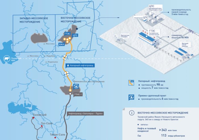 Благодаря применению современных технических и инженерных решений Восточно-Мессояхское месторождение удалось обустроить менее чем за три года. Сегодня на месторождении действуют 51 эксплуатационная нефтяная скважина, подводящий нефтепровод протяженностью 98 км, который соединяет промысел с магистральным нефтепроводом «Заполярье-Пурпе». От низких арктических температур трубопровод защищен слоем теплоизоляции. Для подготовки к транспортировке высоковязкую нефть Восточно-Мессояхского месторождения подогревают на центральном пункте сбора нефти. На месторождении и приемо-сдаточном пункте построены две электростанции суммарной мощностью более 90 МВт, которые полностью обеспечивают промысел электроэнергией. Пик добычи на Восточно-Мессояхском месторождении будет достигнут в 2020 году и составит 5,6 млн тонн нефти.