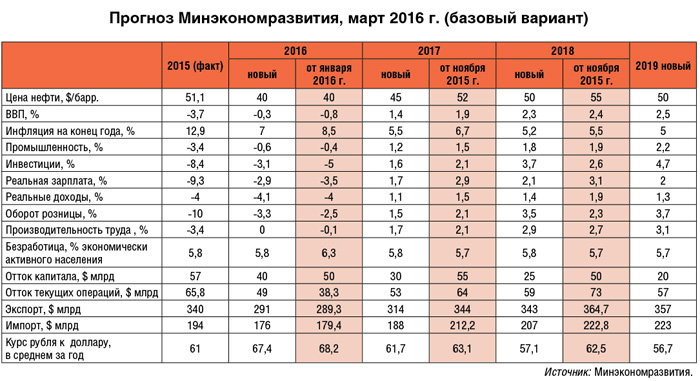 Что касается «золотого ключика» к российской экономике — цены нефти, то теперь и она скромнее прежних оценок. В 2016 г. — $40 за баррель (так и было в январе), в 2017 г. — $45 (в ноябре 2015 г. было $52), дальше — стабилизация на уровне $50.