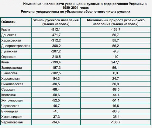 Спустя 75 лет на Украине прошла первая и последняя перепись за 25 лет независимости. Перепись определила: при общем сокращении численности населения по сравнению с 1989 годом на 3,25 миллиона человек, украинцев стало больше на 122,6 тысячи, а вот русских – на 3,02 миллиона меньше (!)