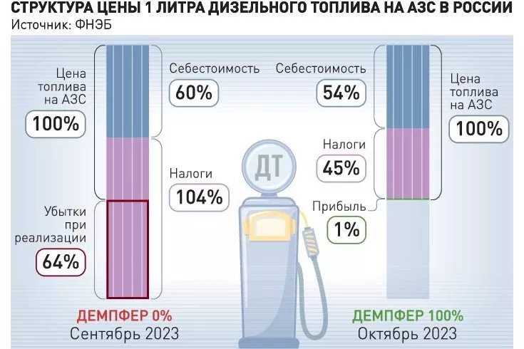 В сентябре же в формулу демпфера решено было ввести коэффициент 0,5. Иными словами, уполовинить выплаты. А теперь добавим сюда два обстоятельства, о которых говорили в самом начале. Средняя цена на российскую нефть Urals при отгрузке из российских портов составляла в сентябре, по данным минфина, 83,08 доллара за баррель. Средний же курс рубля был выше 96 рублей за доллар. Это значит, что в сентябре баррель экспортной нефти стоил в среднем чуть дороже 8000 рублей. И налоги берутся именно с такой суммы. Чтобы вы понимали - в январе - марте цена была ниже 4000 рублей, в апреле - июне ниже 5000 рублей. Нефтяные компании не могли и платить налоги в полном объеме (особенно с учетом ряда изменений в НК РФ в 2022-2023 годах, повышающих налоговую нагрузку для отрасли), и держать низкие цены на внутреннем рынке. Расчеты показывают, что если взять ситуацию сентября, то без демпфера нефтяники просто получали бы убыток примерно в 60% от цены дизеля на заправке.