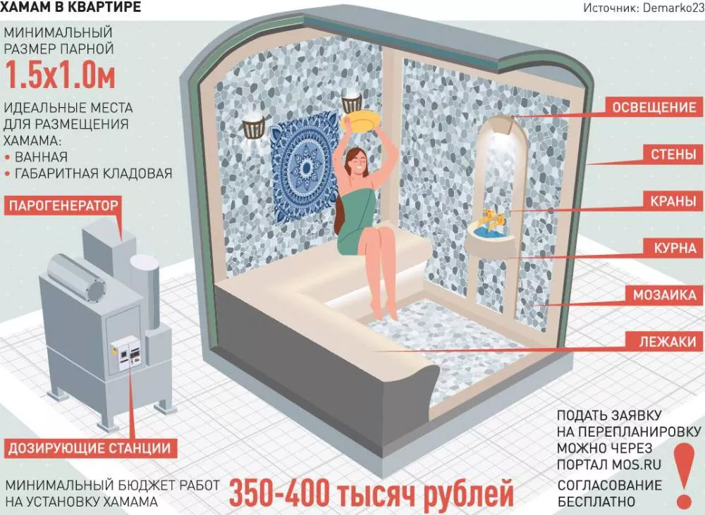 Кроме того, в хамамах всегда есть курна - специальная раковина с водой. Поэтому хамамы можно устанавливать только в так называемых мокрых зонах с соответствующей гидроизоляцией - ванных, санузлах или постирочных. "Это не такое дорогое удовольствие, как кажется, - разъяснил Иван Митяев. - Гораздо сложнее согласование, так как это потребует перепланировки". Как разъяснили в компании Demarko23, специализирующейся на установке бассейнов и хамамов, минимальный размер парной должен составлять не менее 1,5 на 1 метр. Это само помещение хамама с лежаками, курной, освещением, кранами.
