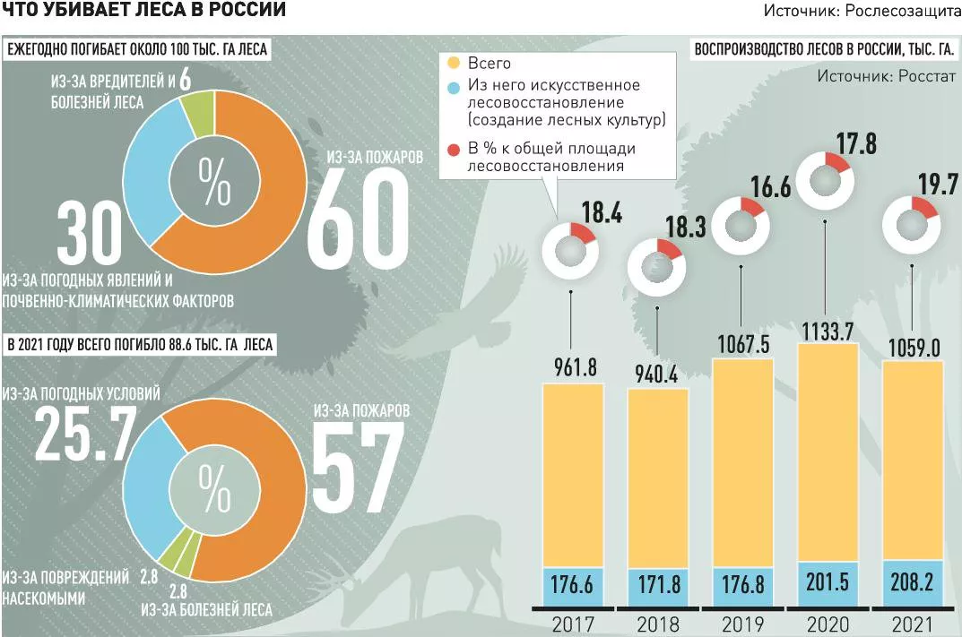 Пожары остаются основной причиной гибели леса в России, отметил директор "Рослесозащиты" Виталий Акбердин. При этом гибель от пожаров в год их прохождения - довольно редкое явление, поврежденные огнем леса постепенно умирают в течение 3-5 лет, отметил эксперт. "Размеры гибели от пожаров в значительной степени зависят от породного состава насаждения и сроков прохождения огня. Наибольшую гибель вызывают пожары, которые возникают в конце лета, когда в лесу много подсохшего горючего материала", - отметил он.