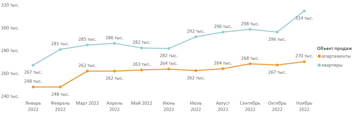 Изменения цены в первую очередь затронуло квартиры (+6,2%). Основной причиной роста цен в ноябре 2022 года стала индексация цен в проектах компании ПИК. Апартаменты также в среднем стали дороже, но их динамика изменений более плавная (+1,1%).