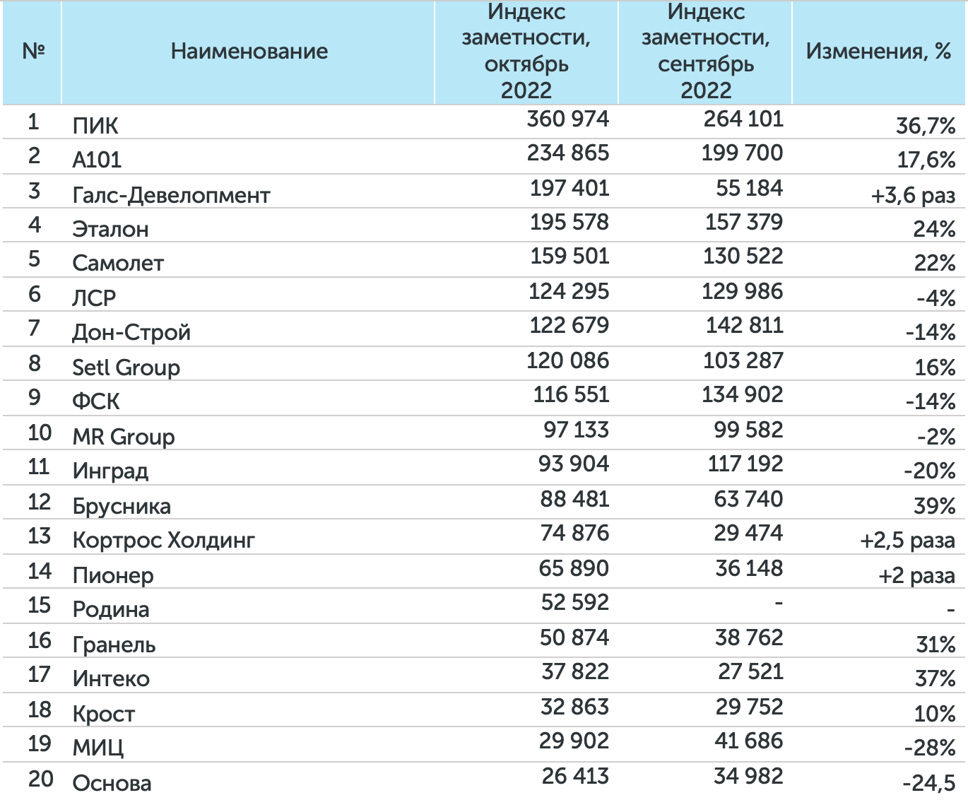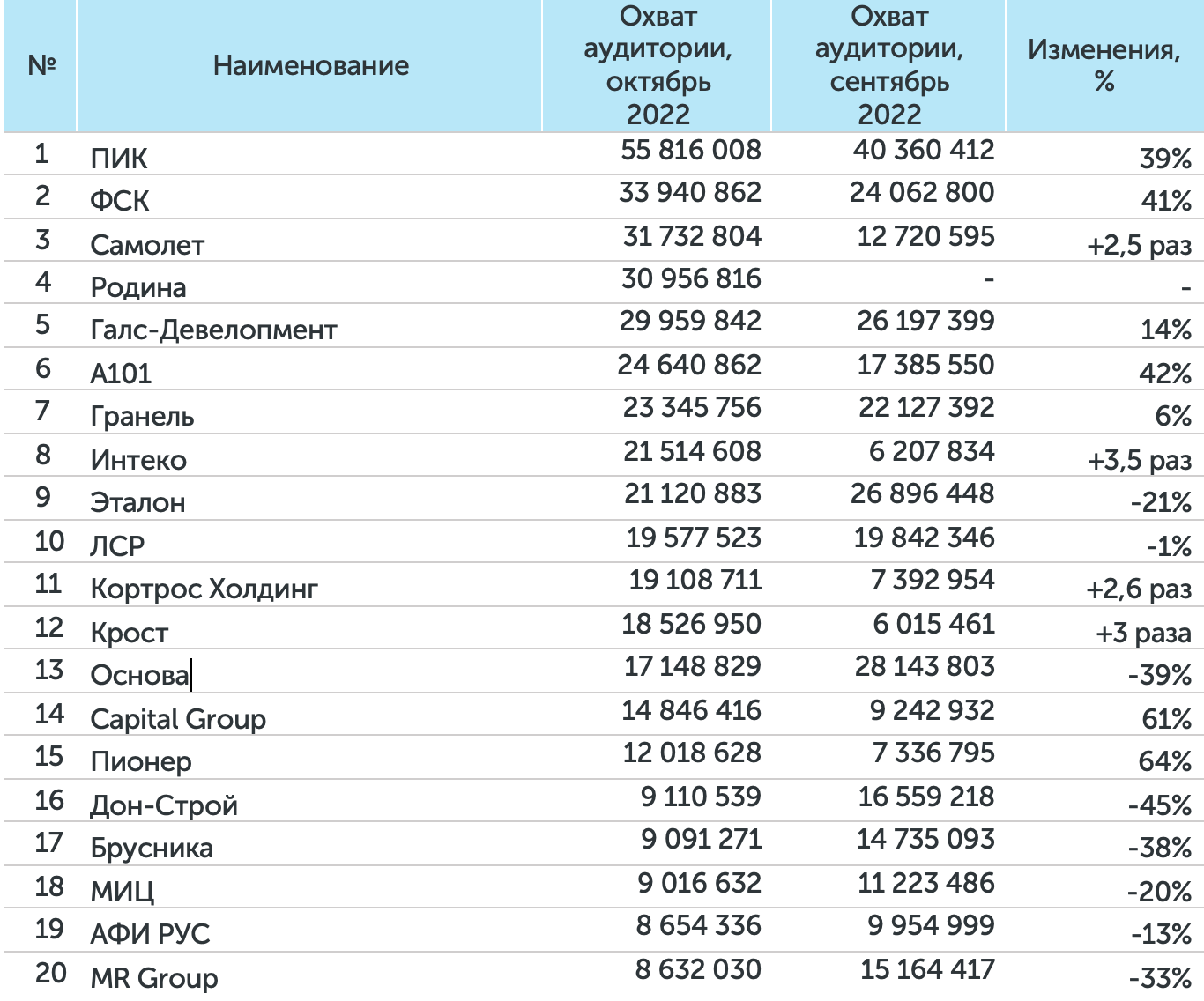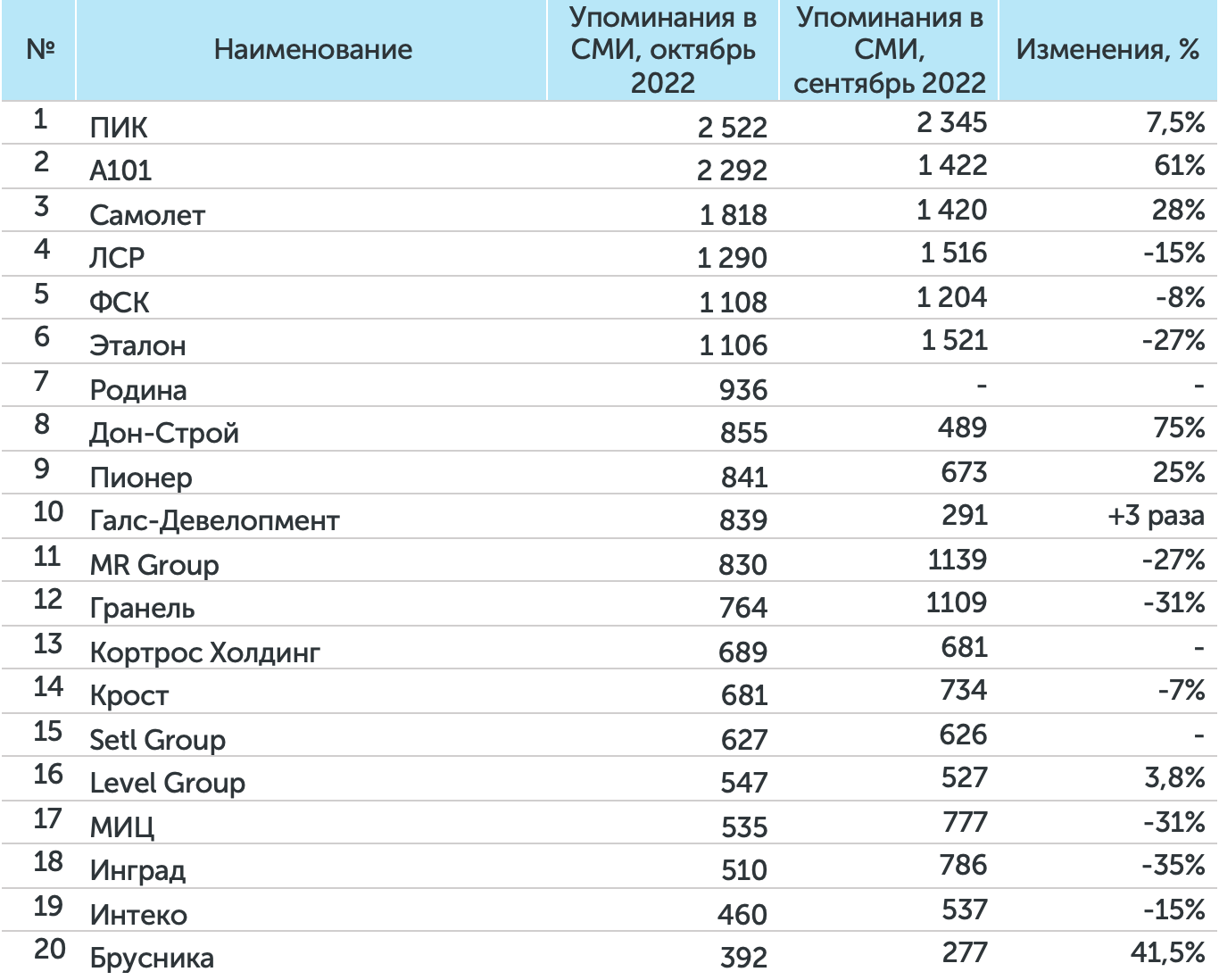 В октябре 2022 года топ-20 застройщиков пополнил новый участник – группа «Родина» (4 место по охвату аудитории, седьмое место по количеству упоминаний и пятнадцатое – по «заметности» компании в СМИ). Широкий охват получило сообщение о том, что группа «Родина» и ГК МИЦ создали совместное юридическое лицо, в котором доля группы «Родина» составляет 51%, для реализации ряда общих девелоперских проектов. Кроме этого, группа «Родина» планирует застроить участок у Яузы на северо-востоке Москвы, что также освещалось в СМИ. Привлек внимание СМИ опрос, который провел застройщик среди будущих жителей жилого культурно-образовательного кластера Russian Design District, о предпочтениях и мотивах в спорте.