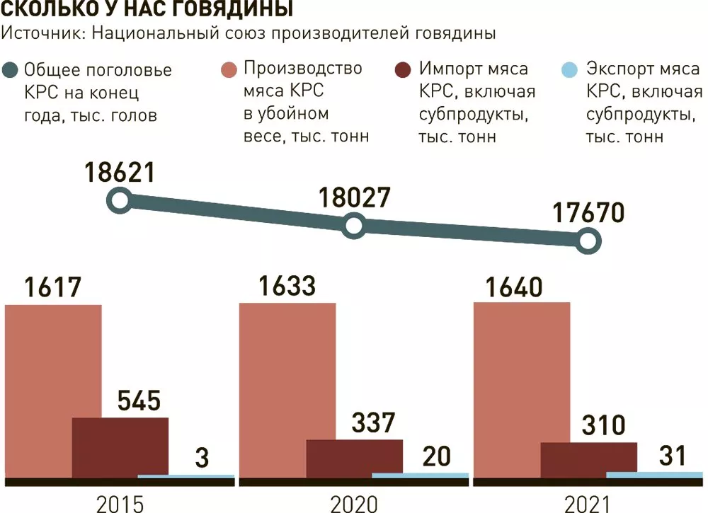 Гендиректор Национального союза производителей говядины Роман Костюк согласен, что цены на говядину "неминуемо будут расти" если не в 2023 году, то в 2024-м. В России наблюдается снижение объемов производства говядины. Формально в этом году может сложиться рост производства этого мяса на 3-5%, до 1,67 млн тонн. Но по информации союза, произойдет это в том числе за счет сокращения маточного поголовья. Слишком сложный и долгий бизнес при быстро меняющихся условиях делает выращивание крупного рогатого скота неинтересным для инвесторов, поясняет Костюк. По этой причине эксперт прогнозирует снижение объемов производства в следующем году.