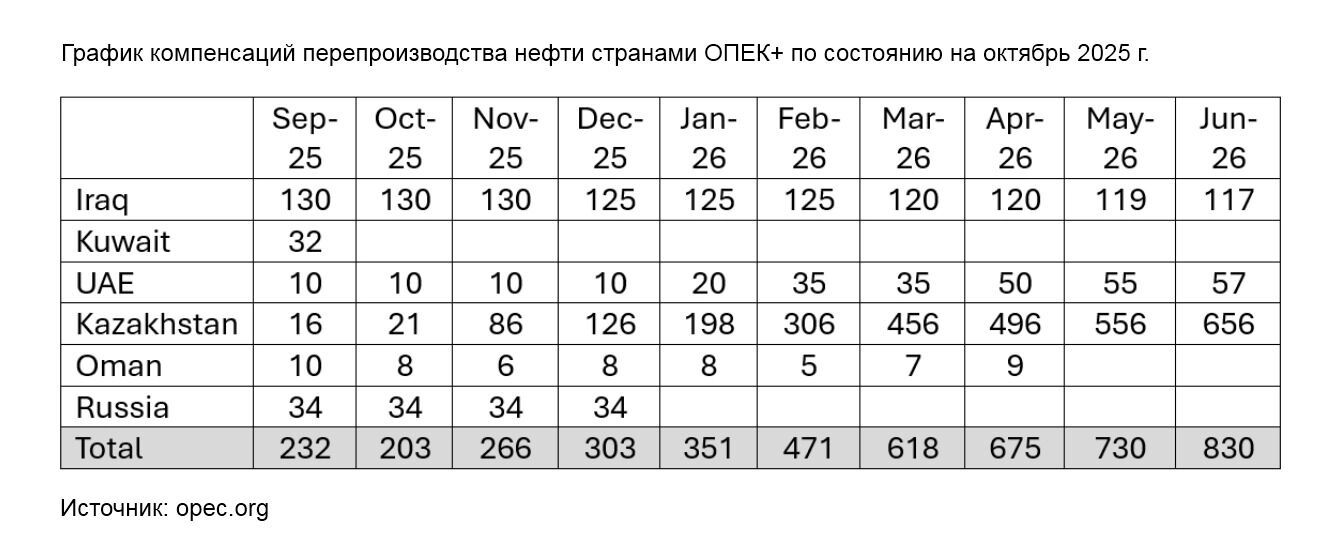 Казахстан: его «долг» вырос и теперь составляет 2,917 млн барр./сут. (а было 2,63 млн барр./сут.). Основную часть ему нужно будет погасить в I полугодии 2026 года, а также чуть более 200 тысяч барр./сут. — в ноябре–декабре этого года;