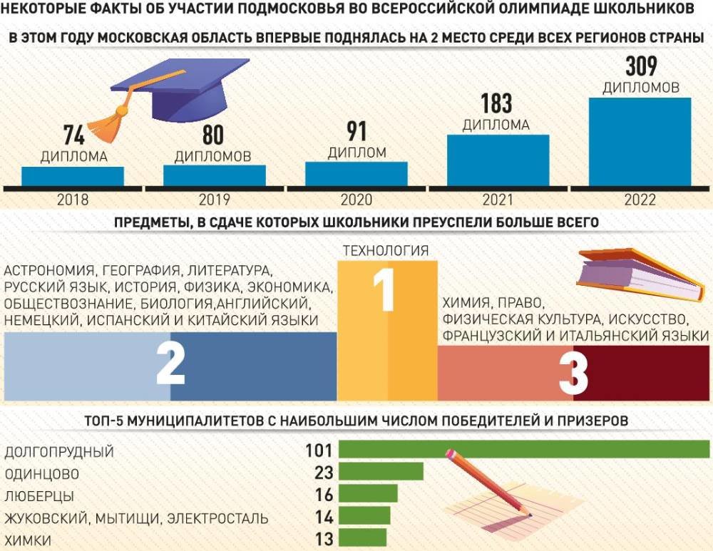 В "меню" Всероссийской олимпиады школьников - 24 предмета. Больше всего призовых мест у подмосковных ребят в физике, обществознании, биологии, истории, географии, литературе и языках: русскому, английскому, немецкому, испанскому и китайскому. "А лидерами по числу учеников, занявших призовые места, стали физтех-лицей имени П.Л. Капицы и физмат-лицей N5 в Долгопрудном, гимназия имени Е.М. Примакова в Одинцове, гимназия N16 "Интерес" в Люберцах и лицей N8 в Электростали", - продолжает Каклюгина. Интересно, что наличие или отсутствие победителей Всероссийской олимпиады в той или иной школе никак не зависит от близости этой школы к МКАД.
