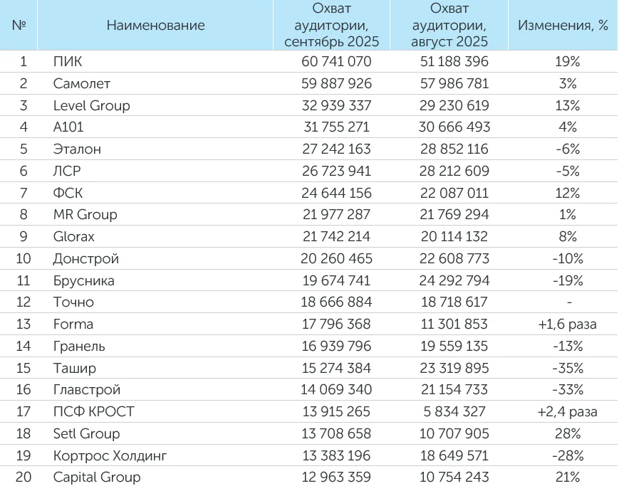 Рейтинг компаний–девелоперов за сентябрь 2025 года