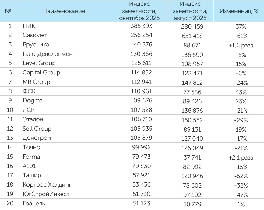 ГК «Самолет» в сентябре 2025 года заняла второе место по количеству упоминаний, индексу заметности и охвату аудитории.
