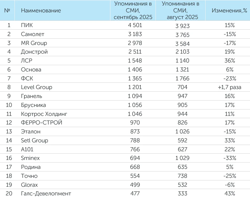 Система мониторинга и анализа СМИ и соцмедиа СКАН-Интерфакс совместно с онлайн-порталом «Строительной газеты» подготовили медиарейтинг девелоперских компаний за сентябрь 2025 года. В лидерах рейтинга сохранили свое присутствие ГК ПИК, ГК «Самолет» и MR Group. В топ-3 вошли Level Group и Брусника.