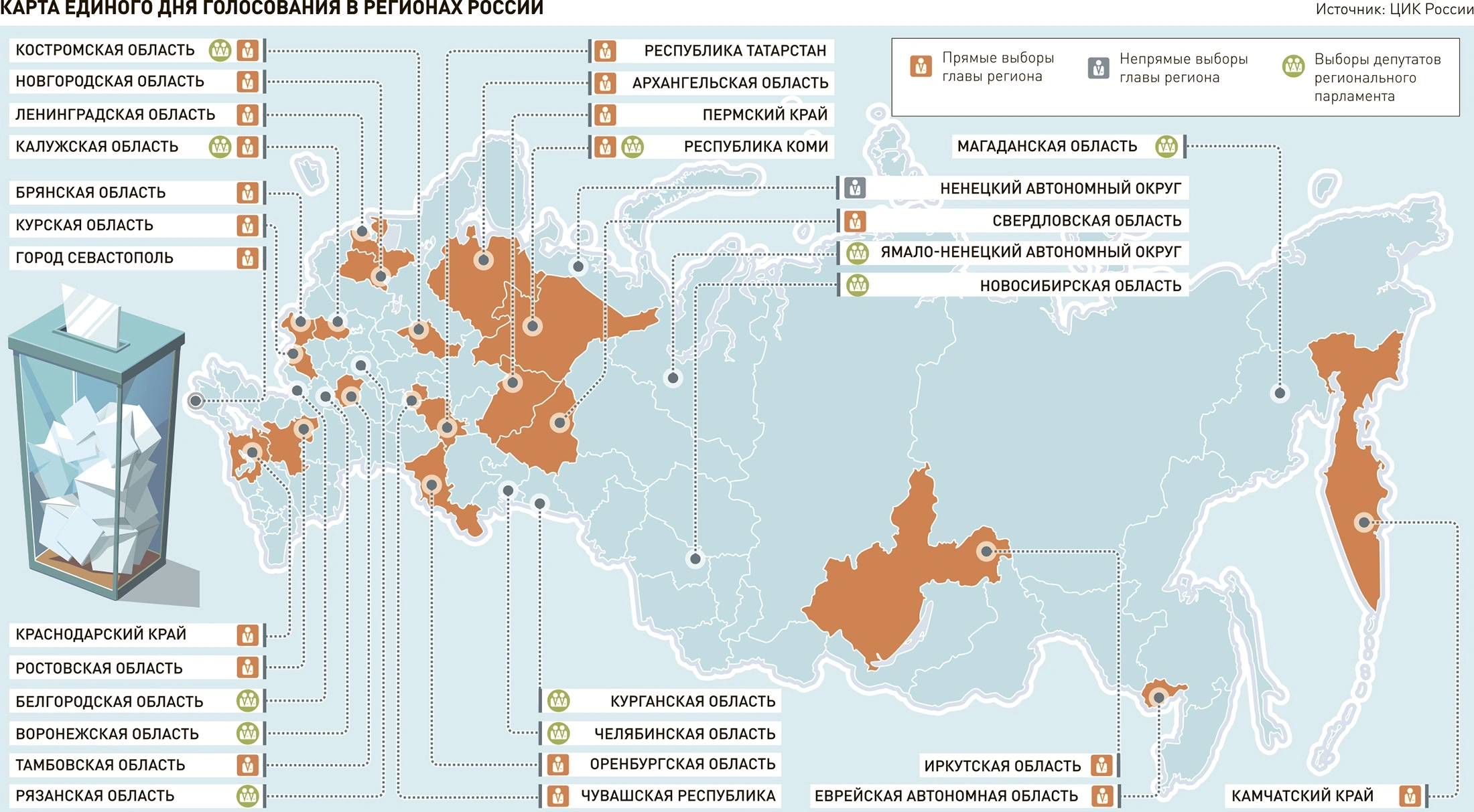 Эти выборы в Центризбиркоме оценили как масштабные. С 12 по 14 сентября на участки пришли жители 81 региона, на выборах разыгрывалось 46 тысяч мандатов и должностей, в том числе 21 губернаторское кресло и места в 11 законодательных собраниях регионов. В списки избирателей были внесены около 55 миллионов человек. Голосование проходило во всех часовых поясах - от Камчатки, где выбирали губернатора, до Калининграда, где состоялись небольшие муниципальные выборы.